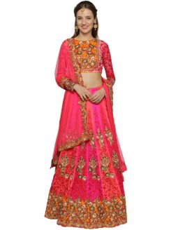 Beige and pink embroidered semi-stitched lehenga choliwith dupatta Beige and pink embroidered choli fabric Beige embroidered semi-stitched lehenga, has a waistband Pink dupatta with embroidered taping along the border