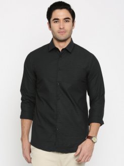 Black solid formal shirt, has a spread collar, button placket, a patch pocket, long sleeves, curved hem