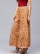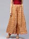 A pair of beige and red printed woven flared palazzos, has a waistband with a zip closure and a drawstring fastening on the left